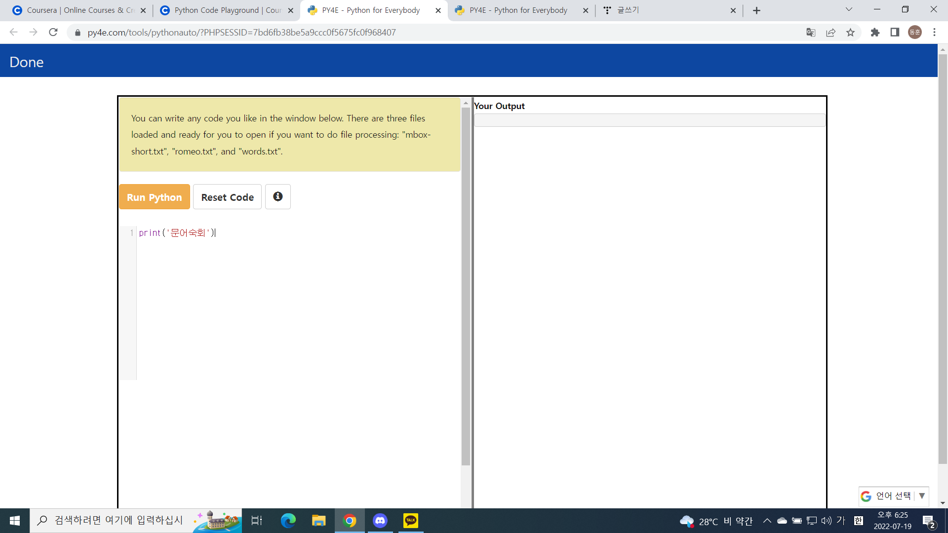 | Programming for Everybody (Getting Started with Python)-4 (0) | 2022.07.19 |